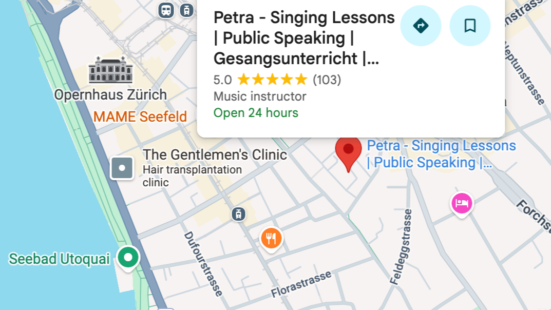 She holds the title of Zurich's #1 Vocal Coach on Google Reviews. With a striking 5.0 score from 100+ happy customers!